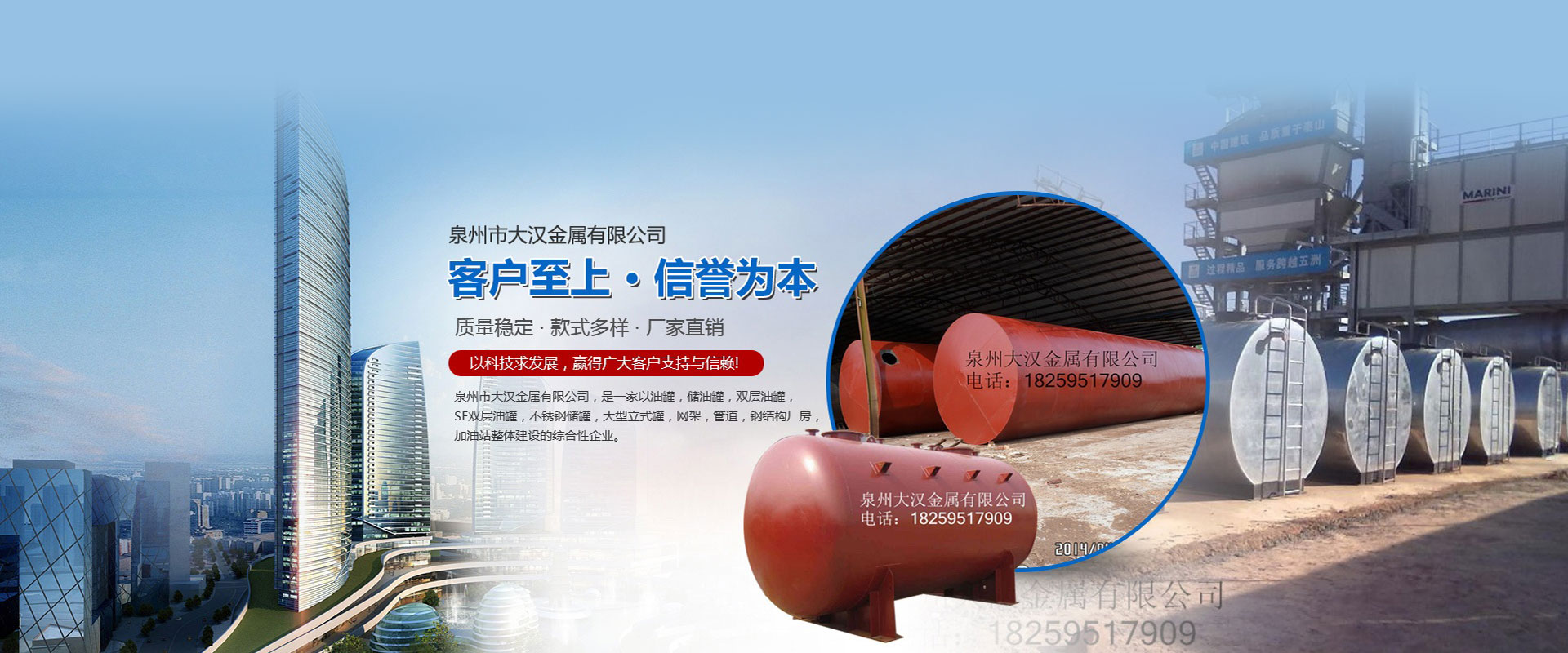泉州市大漢金屬有限公司,是一家以油罐、儲油罐、雙層油罐、SF雙層油罐、不銹鋼儲罐、大型立式罐、網架、管道、鋼結構廠房、加油站整體建設的綜合性企業。本公司以技術人員、施工經驗豐富的工程隊、自動化設備、擁有鋼結構建筑、螺栓球網架設計安裝技術力量,嚴格按照國家容器標準制造,是一家產品開發并生產各種壓力容器和制造金屬結構工程,化工石油工程安裝的大型企業。近多年來,以質量穩定、客戶至上、信譽為本,以科技求發展,贏得廣大客戶支持與信賴。